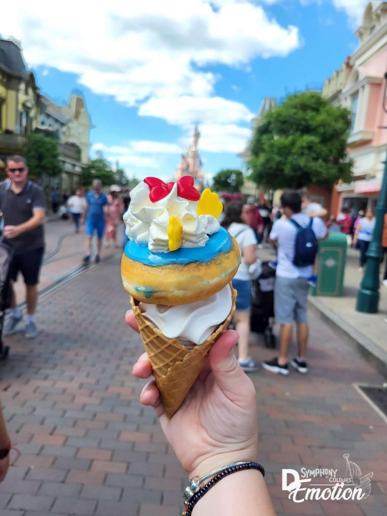 Disneyland Paris a pensé à nous et à l’anniversaire de Donald. Le parc proposait une glace vanille surmonté d’un beignet aux couleurs de notre canard favori. Un délice digne de ce nom.