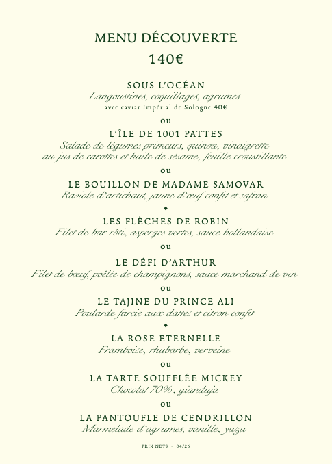 - le Menu Découverte, proposant trois plats différents, au prix de 140 € (hors boissons)