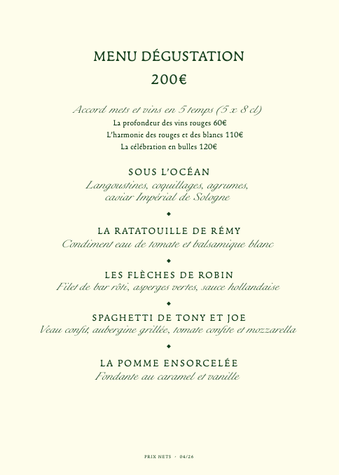 - le Menu Dégustation, proposant cinq plats différents, au prix de 200 € (hors boissons) ;