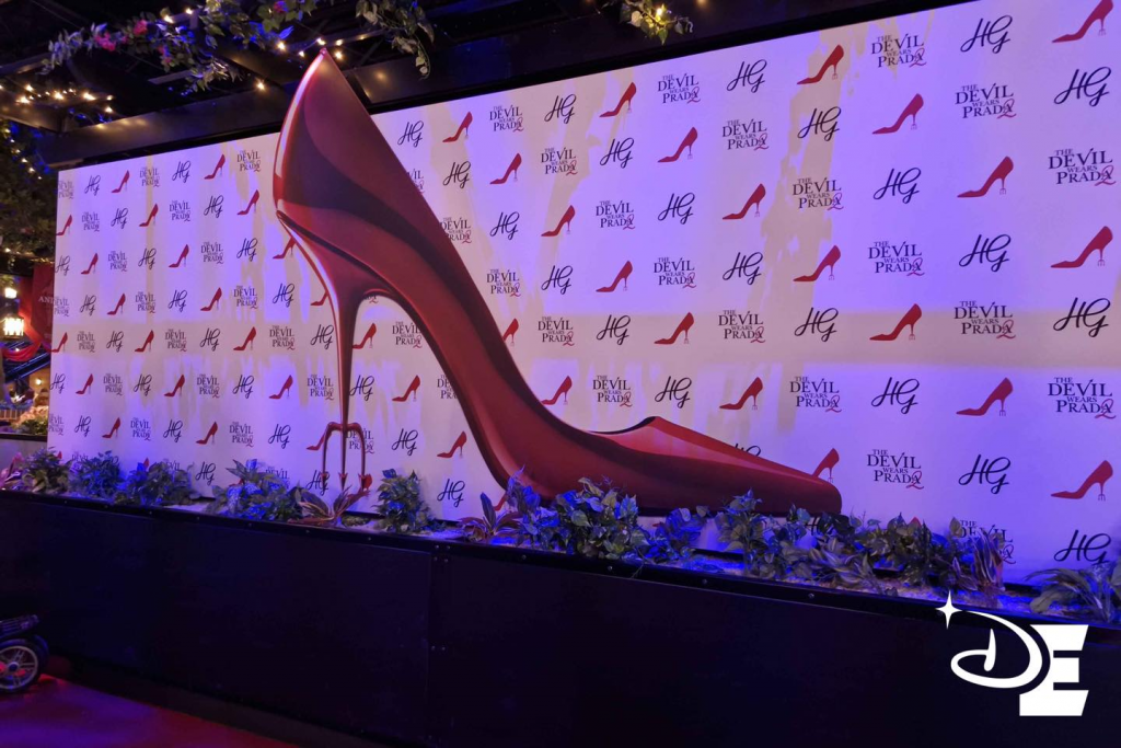 Cela ne dénote pas avec le style holywoodien des lieux, bien au contraire. Les décors installés permettent une véritable immersion dans les coulisses d’un grand magazine de mode. L’élément phare de ce nouveau cadre n’est autre qu’une spectaculaire chaussure à talon rouge, clin d’œil iconique au film original Le Diable s’habille en Prada.
