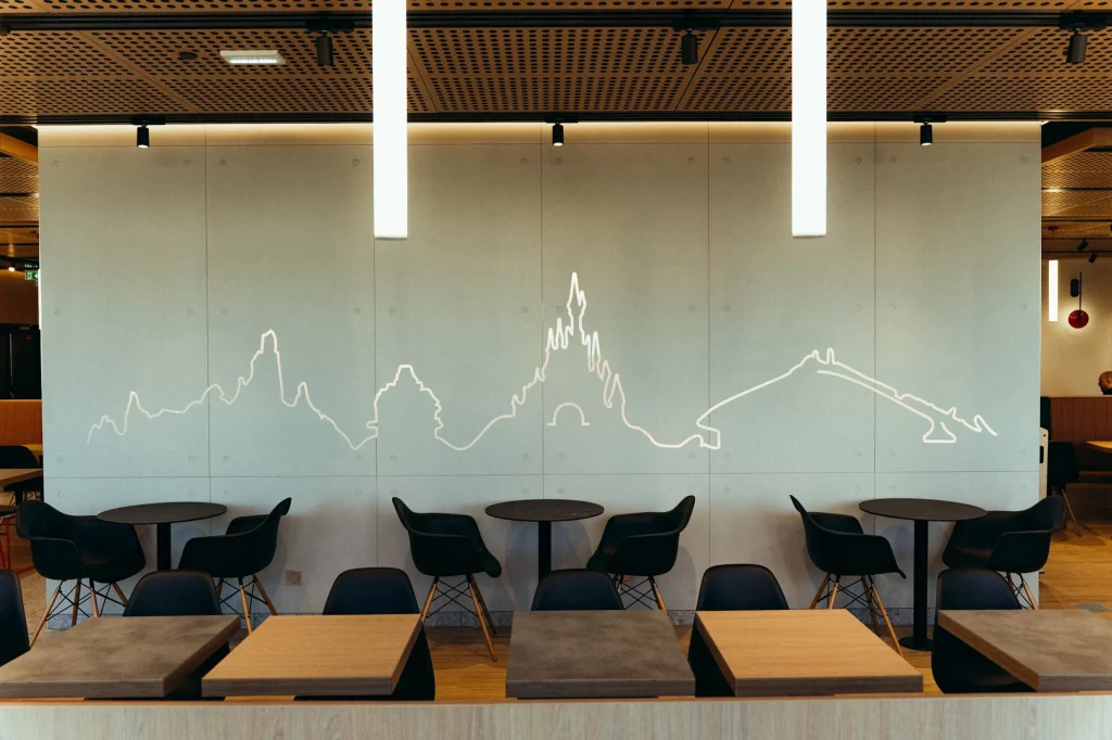 Dès l’entrée, les visiteurs découvrent un vaste espace destiné à fluidifier la prise de commande. Le parcours se veut plus clair et mieux organisé que dans l’ancien bâtiment. Il est également possible de commander à table via QR Code, avec un service à table fonctionnant par géolocalisation.