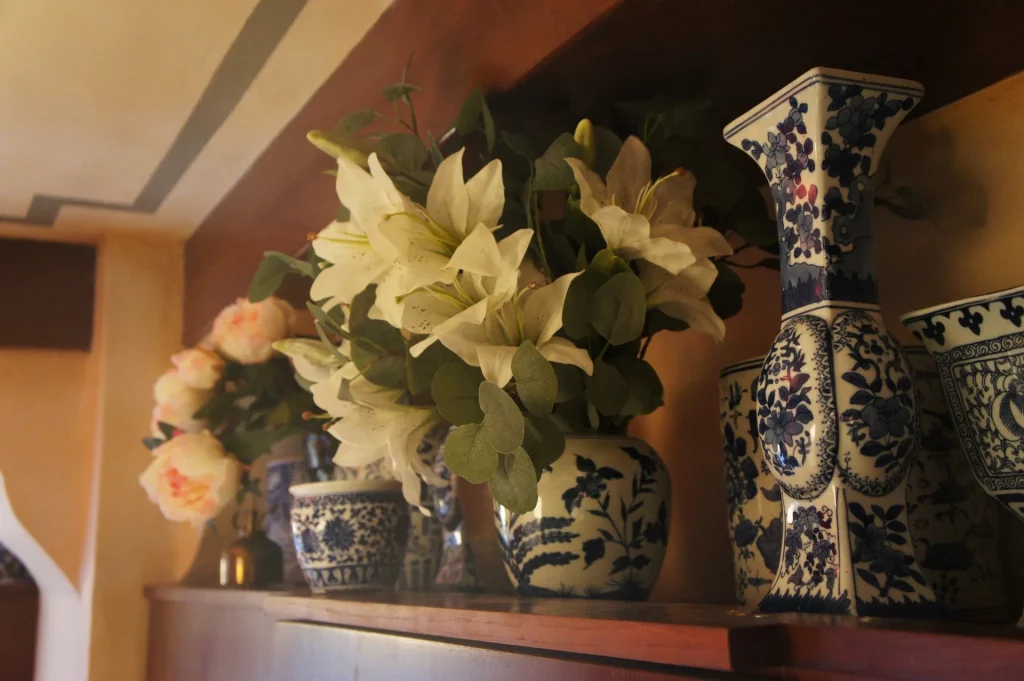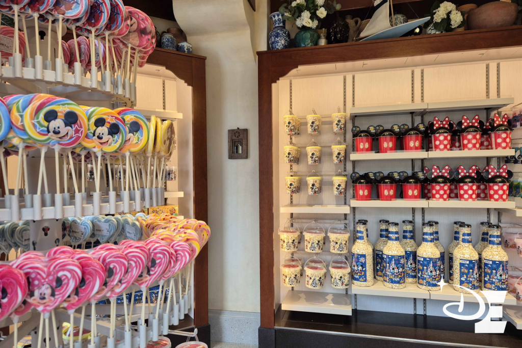 À l’intérieur, l’ambiance chaleureuse des années 1930 se prolonge. D’abord, les murs à la chaux sont légèrement vieillis. Ensuite, les poutres en bois affichent des teintes rouges. Enfin, les luminaires en opale et en verre complètent un décor élégant, parfaitement adapté à ce quartier glamour de théâtres. Les étagères exposent des vases orientaux, des fleurs de lys, des pivoines et des roses aux pétales clairs. Par ailleurs, on y trouve du matériel technique typique des fleuristes, comme des arrosoirs ou des pots en terre cuite. Une affiche sur le langage des fleurs est accrochée au mur. De plus, quelques voiliers miniatures en bois, clin d’œil aux loisirs des parcs d’antan, complètent le décor. Pour rester fidèle au thème, les feuilles des conditions générales de vente, visibles dans tous les points de vente de Disneyland Paris, ont été plongées dans du thé, ajoutant une touche d’authenticité et de patine au lieu.