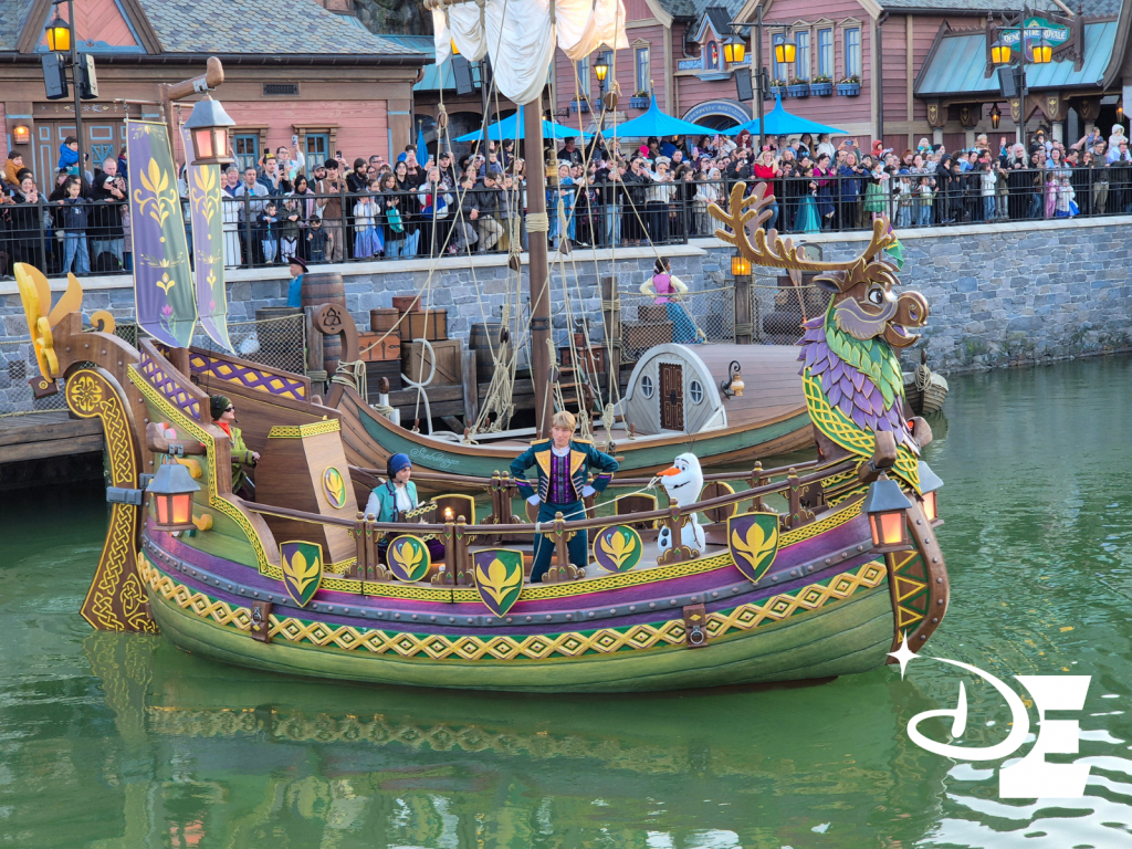 Continuons à propos du spectacle Célébration à Arendelle. Depuis quelques années, Disneyland Paris collabore avec des artisans de l’atelier Prelud. Situés près de Dijon, des sculpteurs, peintres et menuisiers experts dans différents métiers de l’art se sont vus confier la décoration extérieure du bateau de Kristoff. Pendant six mois, une fois l’arrivée de la base flottante, ils ont pu travailler à la main par étapes jusqu’à la mise dans l’eau du bateau en question.